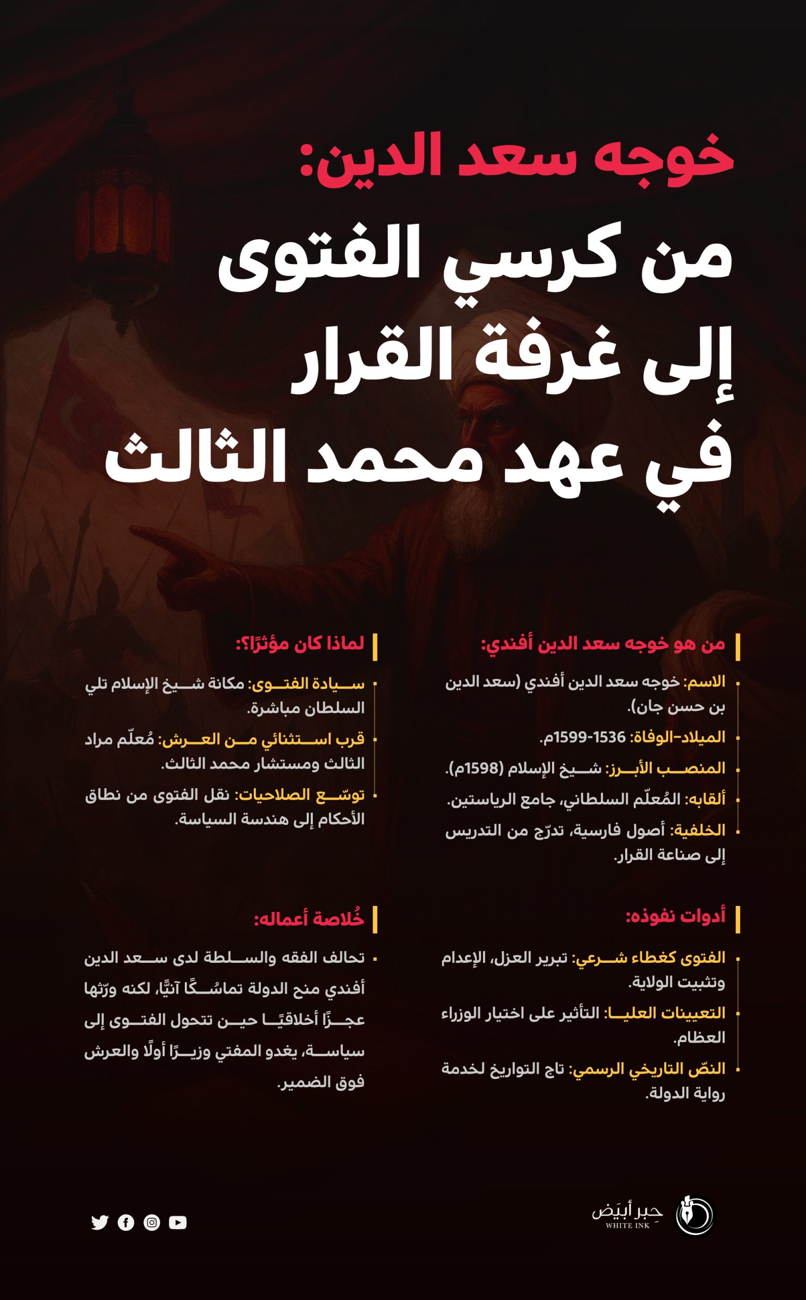 في البلاط العثماني، حيث تختلط العمائم بالتاج، كان للمفتي موقعٌ لا يقلّ هيبة عن السلطان نفسه. فقد جعل آل عثمان من شيخ الإسلام سلطةً تلي العرش مباشرةً، يحتكمون إليه في شرع الله، ويستفتونه في الدماء والقرارات الكبرى، بل ويُضفون بفتاواه شرعيةً على أفعالٍ تُقارب المحرّمات. وفي قلب هذا المشهد يقف خوجه سعد الدين أفندي، الرجل الذي جمع بين العلم والدهاء، فصار ظلّ السلطان مراد الثالث، ثم موجّه ابنه السلطان محمد الثالث، حتى غدا أحد أكثر الشخصيات تأثيرًا في تاريخ الدولة العثمانية أواخر القرن السادس عشر.